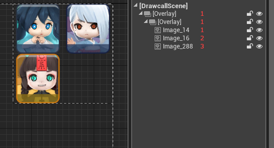 같은 아틀라스를 쓰는 Sprite이지만 Vertical Box 대신 Overlay로만 바꿨을 뿐인데 드로우 콜이 3이 되었습니다. Overlay는 모든 자식들에게 레이어 ID를 1씩 증가시키면서 부여하기 때문에 모든 드로우 콜이 분리됩니다.