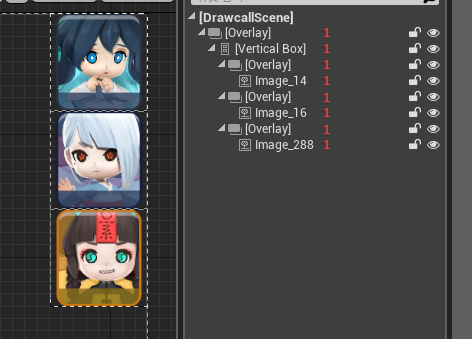 다시 Vertical Box로 돌리고 이번에는 각 이미지를 Overlay로 감싸보았습니다. 놀랍게도(?) 드로우 콜이 1로 나옵니다. Vertical Box 아래 오버레이들은 같은 레이어 ID를 가지고 있고 오버레이의 첫번째 자식도 오버레이와 같은 레이어 ID를 가지게 되기 때문에 결국 모든 Sprite의 레이어 ID가 같아지고 결국 드로우 콜이 1로 나왔습니다.